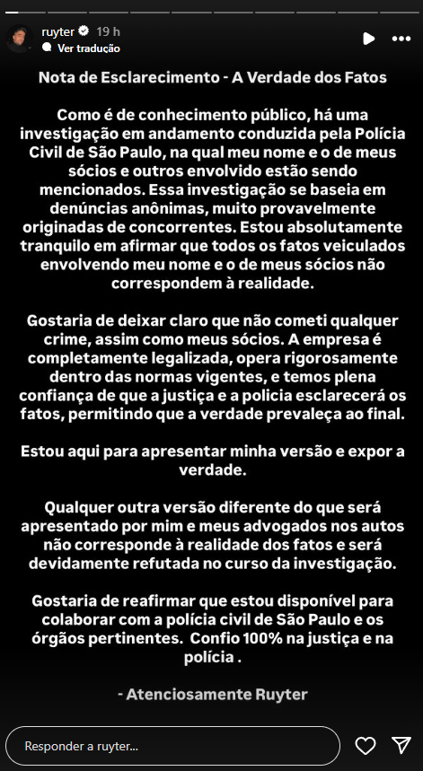 Com 27 anos, Ruyter Poubel se pronunciou publicamente negando qualquer envolvimento em atividades ilegais. Ele afirma que suas empresas operam de forma regular e que está à disposição para colaborar com as autoridades. Apesar disso, a Polícia Civil segue com as investigações, levantando questionamentos sobre a legalidade de suas operações.