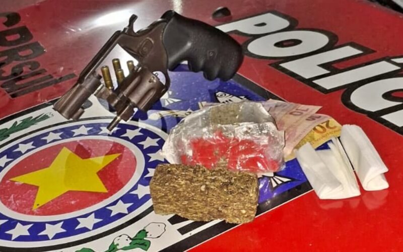 Após revistar o local onde o material foi descartado, os policiais encontraram um revólver calibre 32, marca Rossi, com seis munições intactas, além de 160 gramas de maconha e R$ 70,00 em dinheiro.